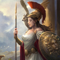 Greek heroine. She is wearing armor and holding a spear, which suggests that she might be portraying a figure from a historical or mythological context. Her pose indicates strength and readiness for battle. The background features