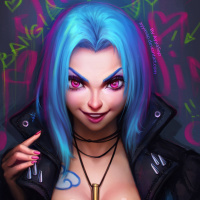 an animated character. The character appears to be Jinx, a playable champion from the game "