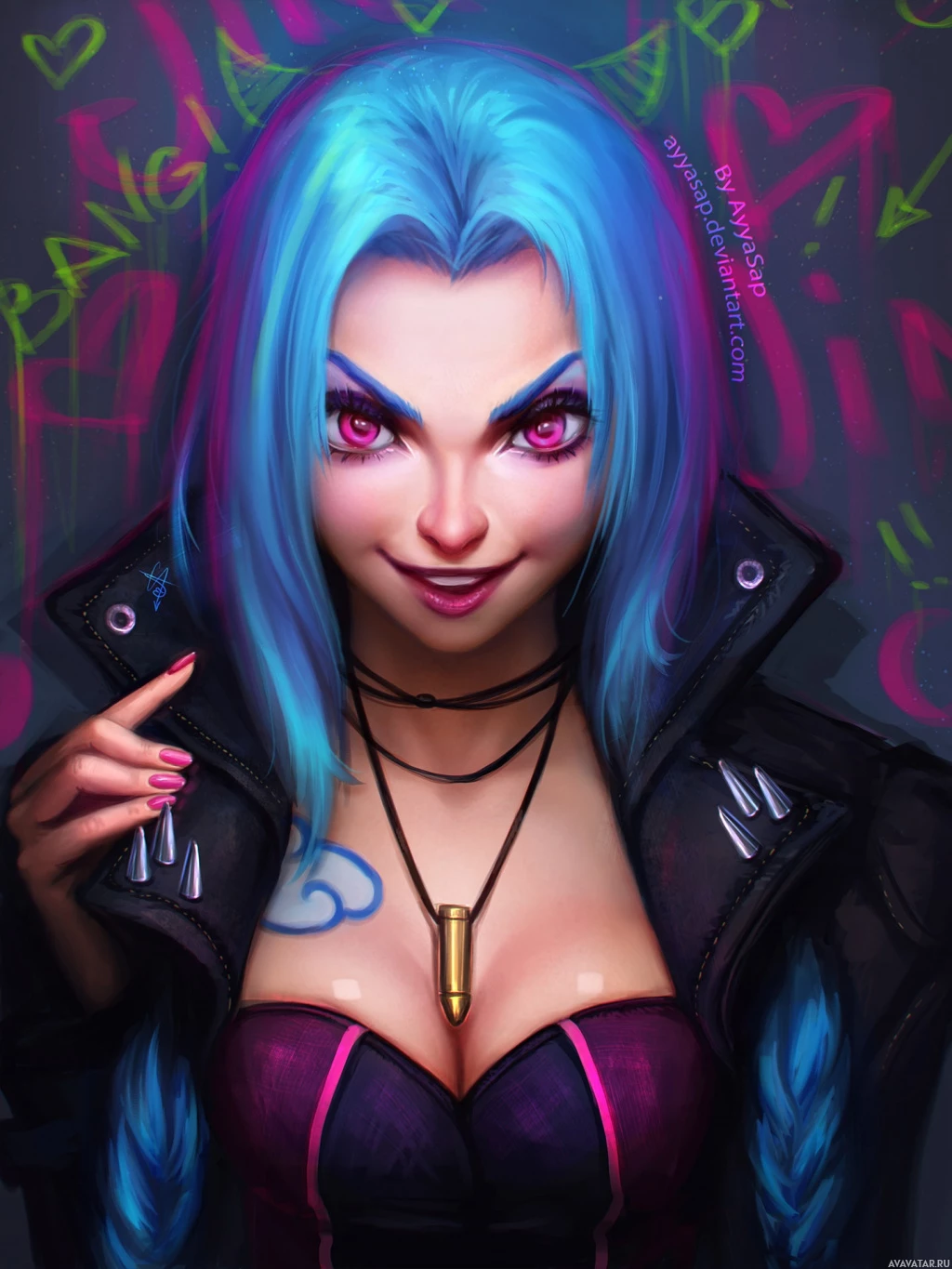 blue hair and a punk-rock fashion style, wearing a black jacket with pink accents, a choker necklace, and sporting a smirk on her face. The background includes various graffiti elements, which is consistent with Jinx's character theme in the game.