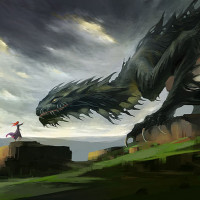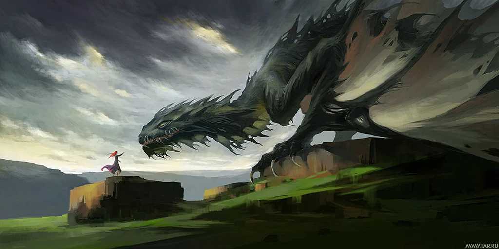 Картинка показывает фантастическую сцену с большим, угрожающим драконом на скалистом обнажении в том, что кажется бурным или пасмурным небом. На переднем плане стоит одинокая фигура, стоящая лицом к дракону, хотя видна только их спина. Рядом также есть руины или сломанные стены. Общая атмосфера предполагает сцену из фантастической обстановки, где герой может противостоять мощному противнику.