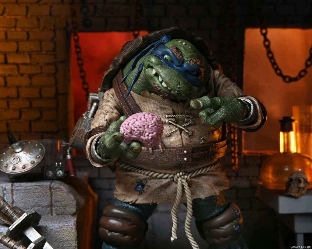 human form rather than as a turtle, and he is dressed in a brown robe with a high collar. In one hand, he holds what looks like