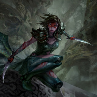 dark elf commonly found in fantasy fiction. This character is depicted with dark skin, pointed ears, and distinctive features such as