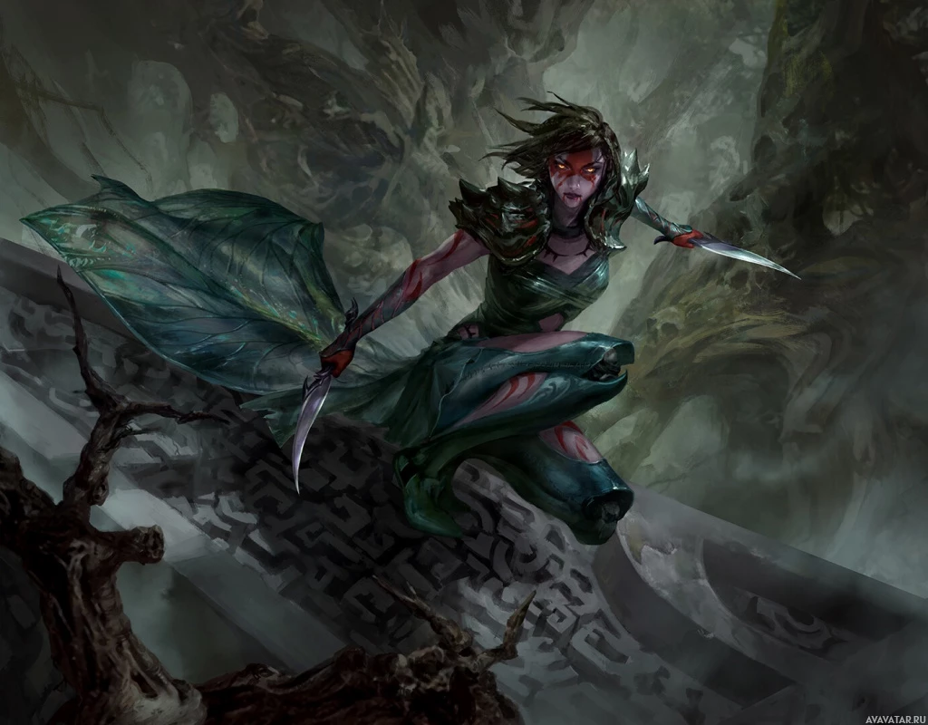 The image features a fantasy-themed character who appears to be a drow, which is a type of