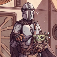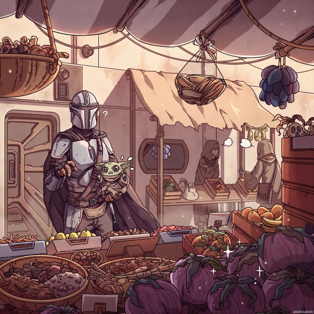 the Star Wars franchise, standing inside what appears to be a shop with various food items on display. He is holding a small