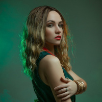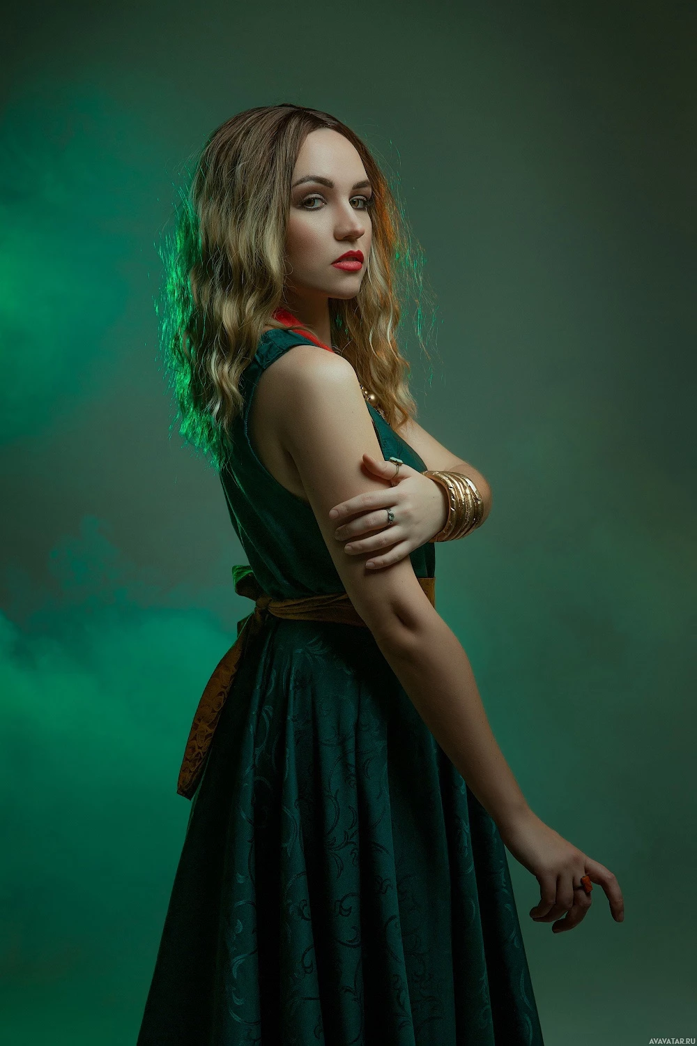 a green dress and accessories that match the fantasy theme of the game. The background has a green, atmospheric effect which complements the overall fantastical and thematic setting associated with cosplay or