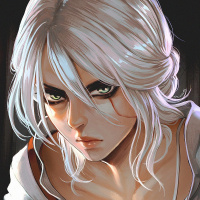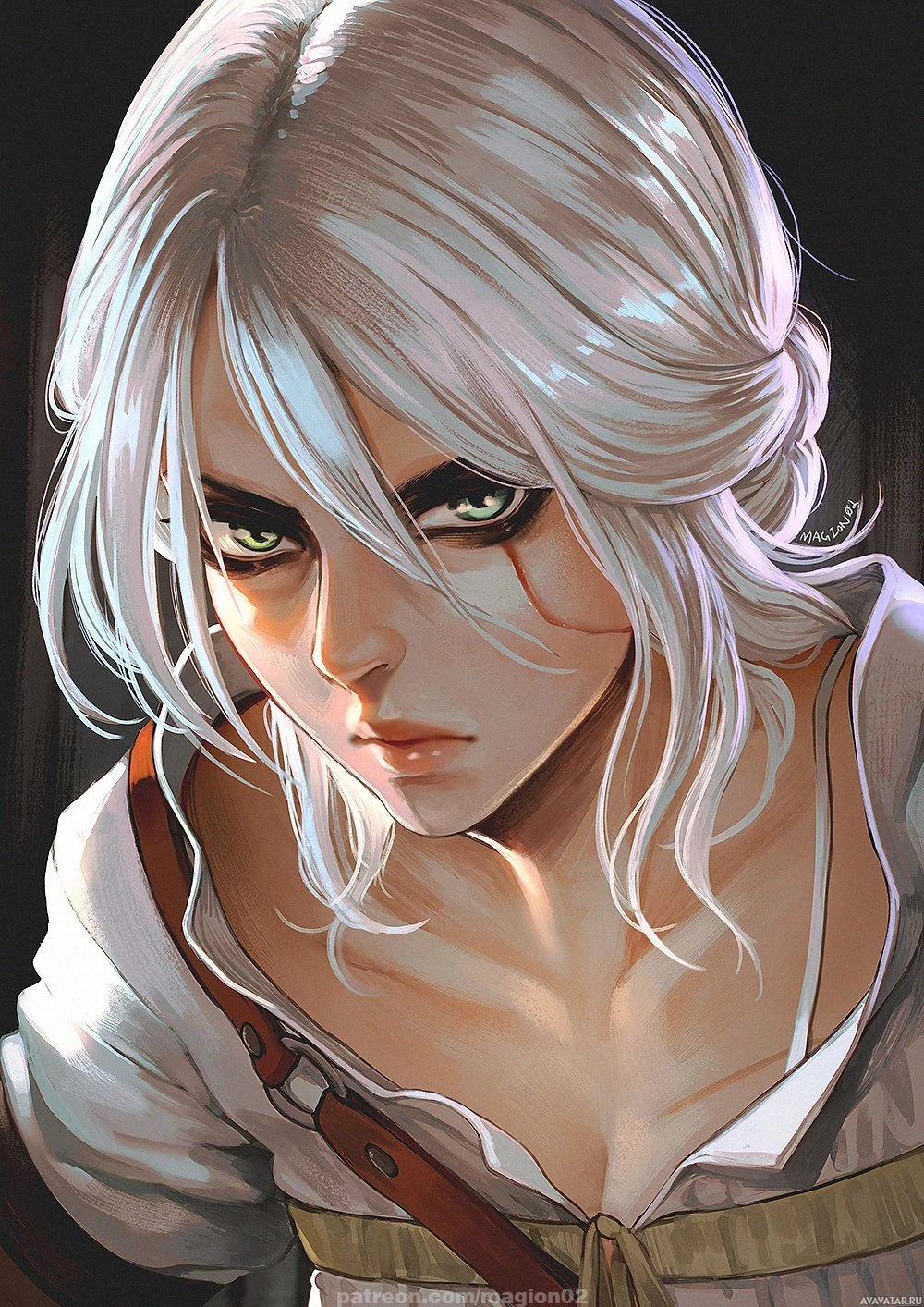 the video game "The Witcher 3: Wild Hunt," specifically the playable character Ciri. She is portrayed in a close-up shot with