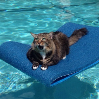 pool noodle. The setting appears to be an outdoor swimming pool, possibly in a residential area, as there's a house visible in the background with
