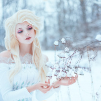 blonde hair, wearing what appears to be a fantasy or princess-like outfit. She is holding a branch and touching some flowers that are sprouting from it. The setting looks like winter, with