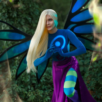 blonde hair and are wearing a dress with a mix of purple, blue, and yellow colors, along with wings on their back. The person is standing outdoors among greenery. There's also a circular