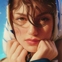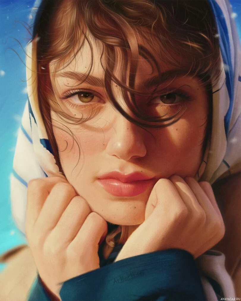 the natural lighting on her face and the presence of what looks like snowflakes falling around her. Her attire includes a scarf or headwear, possibly a bandana or hood that's tied at the neckline, contributing to a casual yet stylish look. The overall tone of the artwork is warm and inviting, with