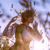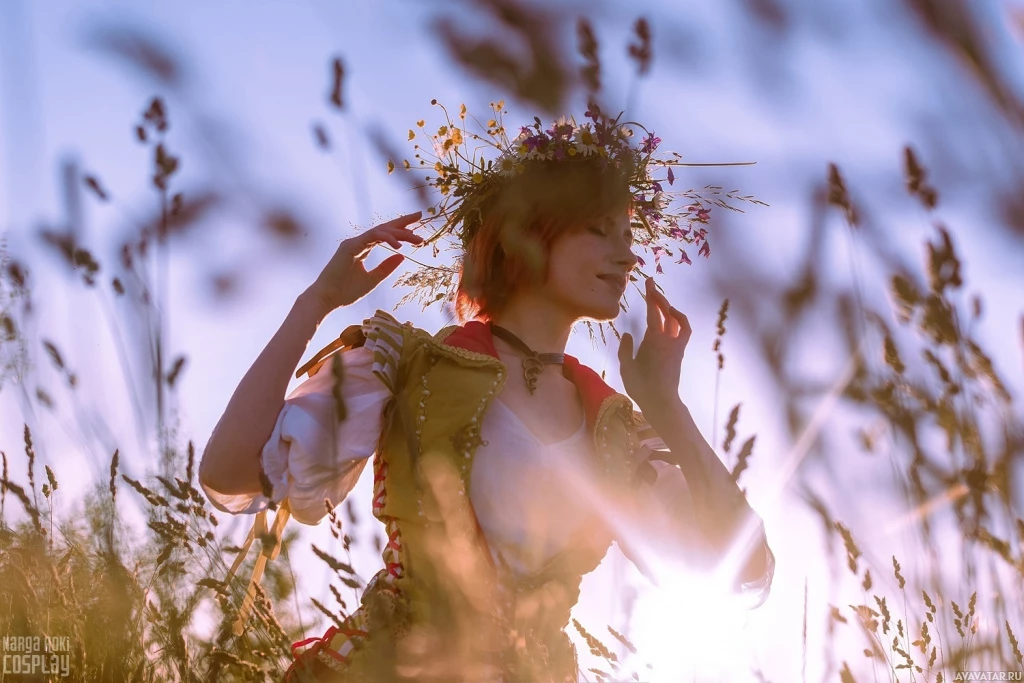 a warm glow. The individual has flowers and foliage adorning their head, adding to the fantasy-themed appearance. This scene is commonly associated with cosplay events or photoshoots where fans dress up as their favorite characters from various media, including