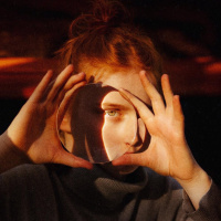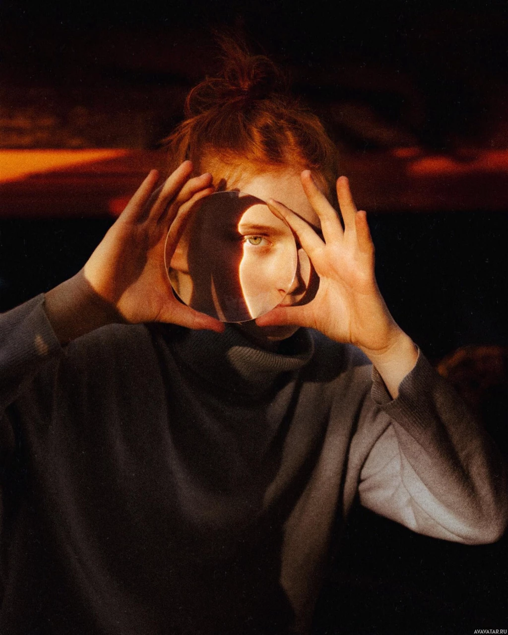 red hair holding up her hands, framing her face as if she's looking at something interesting or captivating. Her eyes are directed towards the camera, and her expression seems to be one of curiosity or wonder. The image has a vintage quality to it, which adds an element of nostalgia.