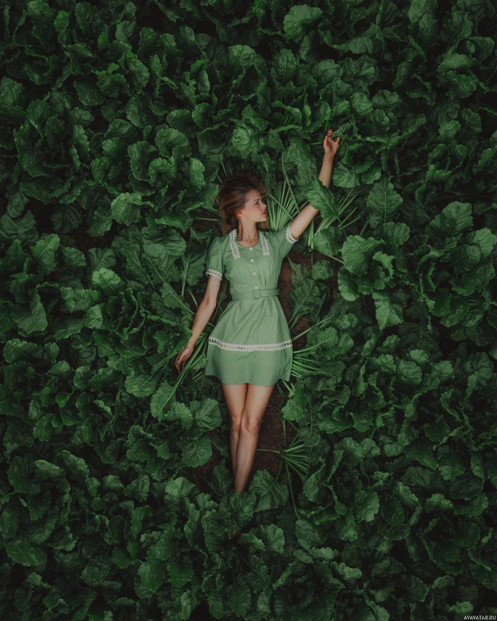 green foliage that appears to be freshly grown and lush. She is wearing a light-colored dress with