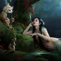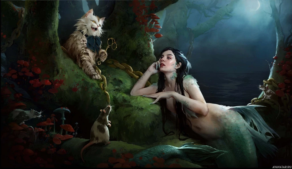 vantage point. In the foreground, there are various other animals, including a mouse and what seems to be an owl, also looking towards the mermaid. The setting is enchanting, with moss-covered rocks and
