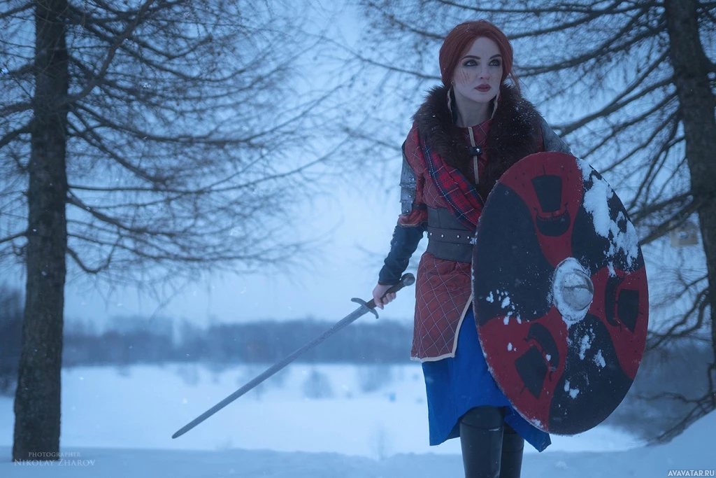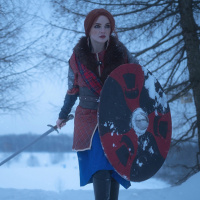 The image shows a person dressed in medieval-style clothing, which includes armor and a helmet. They are holding a sword and appear to be standing outdoors during winter, as indicated by