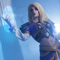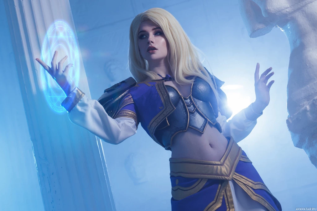 На картинке изображен женский персонаж, который, по-видимому, является косплеем Джайны Праудмур из игры "Warcraft". Она изображена в фантастической обстановке с футуристическими элементами, такими как светящаяся голубая энергия вокруг ее руки. Персонаж одет в доспехи, у него длинные светлые волосы. Судя по выражению ее лица, она произносит заклинание или использует какую-то магию.