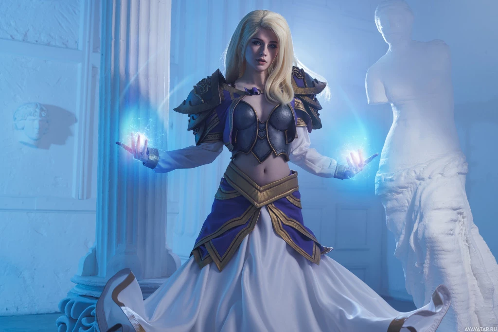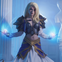 Jaina Proudmoore, a character from the Warcraft series of games. The cosplayer is wearing armor and holding staffs that are emitting