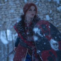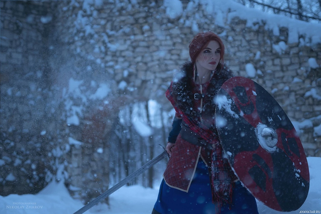 a snowy day, with snowflakes visible around her, suggesting it's either snowing or has recently snowed. She is holding a sword in one hand and a shield in the other, which are typical accessories for characters from "The Witcher" series, indicating that she might be portraying