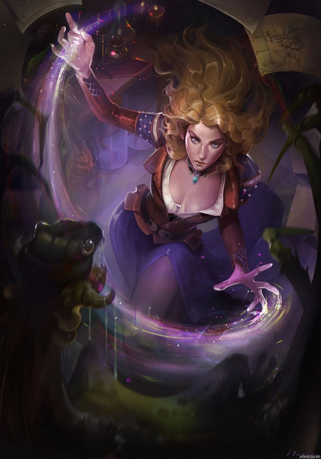 purple energy around her right hand. Her attire suggests a medieval or fantasy setting, and she has