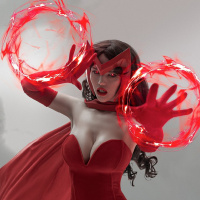 На картинке изображена женщина, одетая как персонаж Алой ведьмы из комиксов Marvel. Она одета в красное боди, к спине у нее прикреплены крылья, а в руках она держит два кольца, которые светятся магической энергией. Этот наряд для косплея и поза наводят на мысль, что она изображает супергероиню, известную своими мистическими способностями и связью с магией.