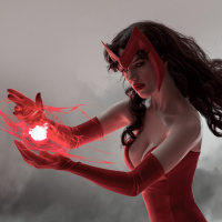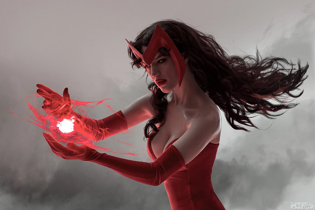 The image features a character who is depicted as Scarlet Witch from the Marvel