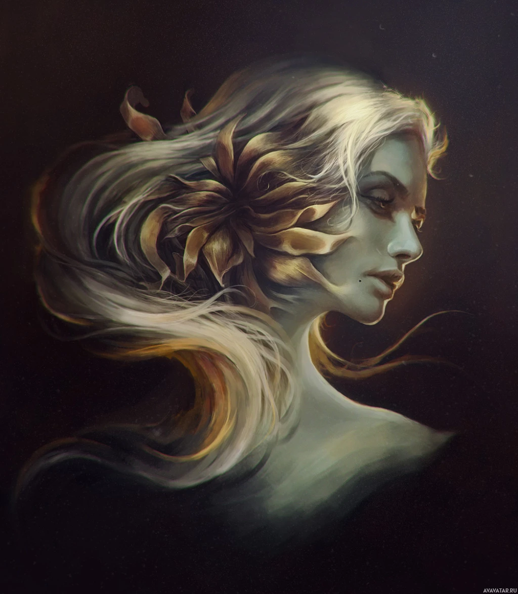 a serene expression and is adorned with what appears to be a leaf or feather on her head, adding an element of nature to the artwork. The background is dark, which helps to highlight the subject's face and the intricate details in her hair. The art style is somewhat abstract yet detailed, focusing on textures and shading to create depth.