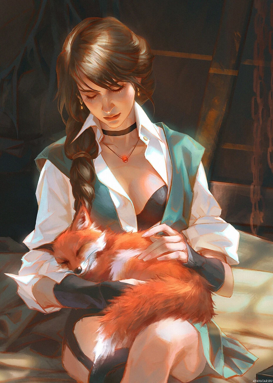 a gentle expression on her face and seems to be enjoying the company of the fox.