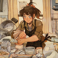 a young girl working in a kitchen, preparing food. She's wearing an apron and appears to be focused on her task. The scene is cluttered with various
