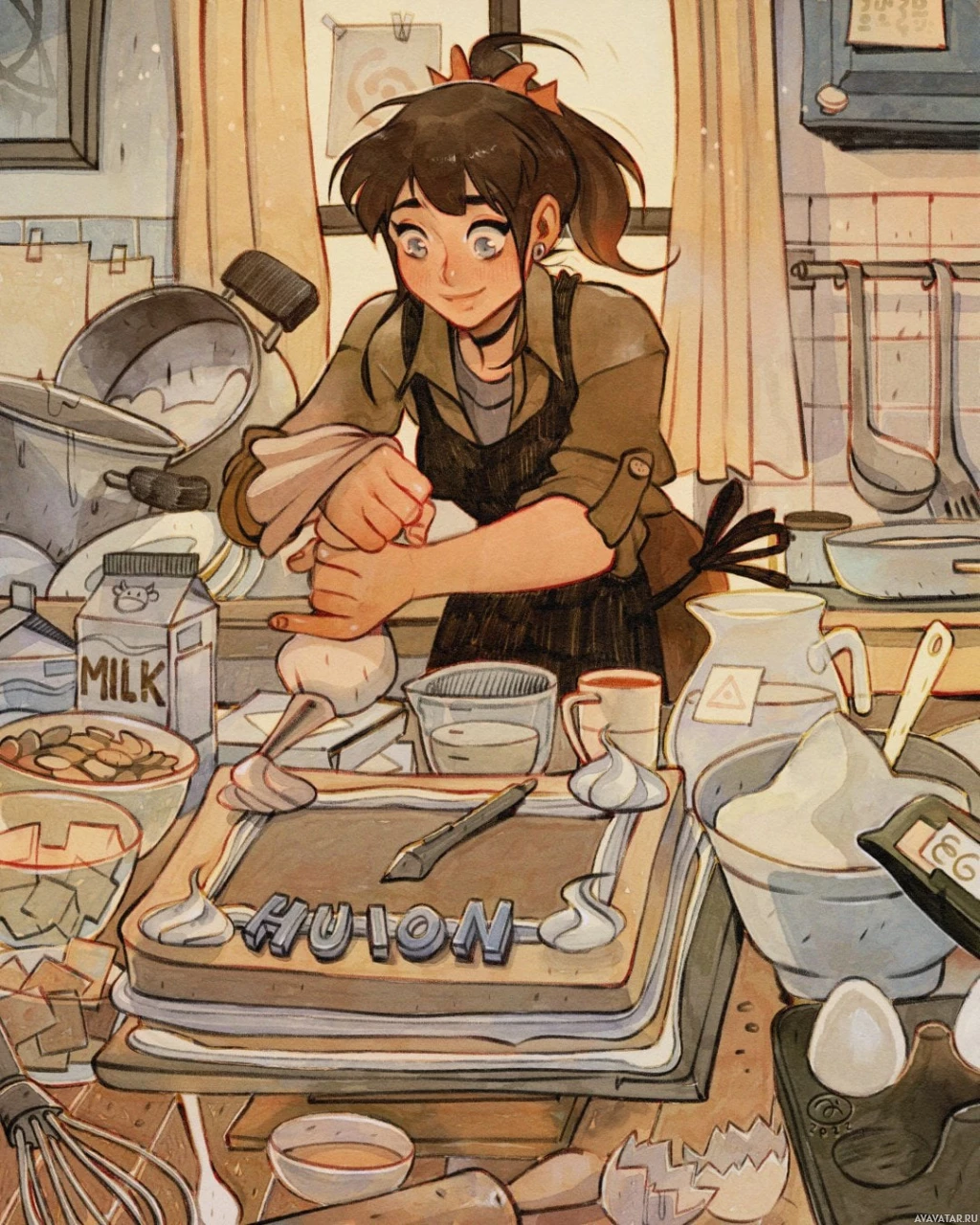 cooking utensils and ingredients such as bowls, cups, spoons, and what looks like flour and eggs. There are also some Japanese words visible in the image that seem to say "Sushi" and "Noodles," suggesting that she might be making these types of dishes or ingredients for a meal. The art style is vibrant and colorful, with a cartoonish quality.