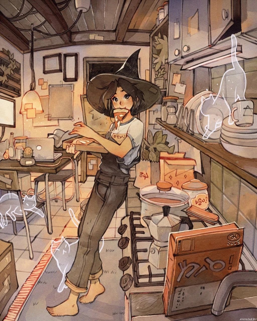 a young woman standing in a room that resembles a kitchen or a studio apartment. She is wearing a witch's hat and seems to be enjoying