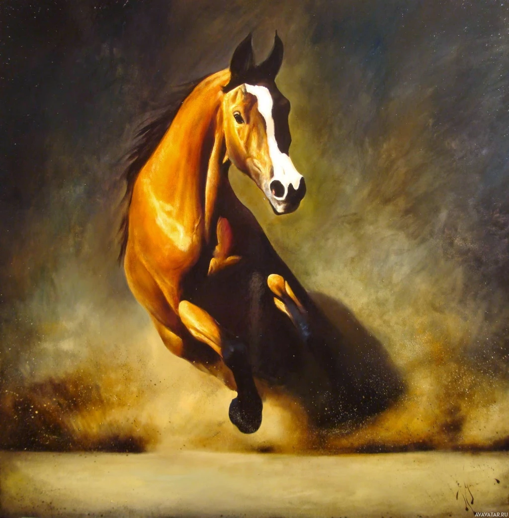 a sense of speed and movement by contrasting with the brightly lit horse. This is an oil painting that captures the energy and majesty of