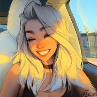 white hair who appears to be in the passenger seat of a car. She's smiling and seems to be enjoying herself, possibly taking a selfie using her phone. The sunlight suggests it might be