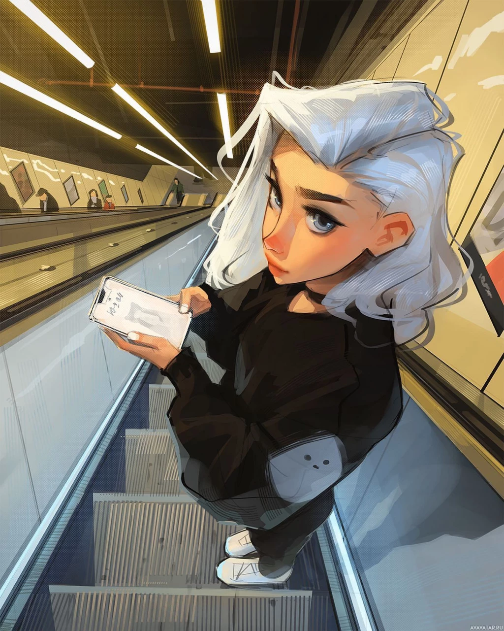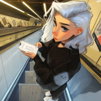 white hair, holding a phone. She is standing on the steps of what appears to be a subway or train