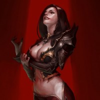На картинке изображен женский персонаж с темными волосами, одетый в доспехи. Она, кажется, стоит перед красным фоном, возможно, для драматического эффекта. Стиль предполагает, что она может быть персонажем из видеоигры или фэнтезийной обстановки.