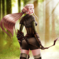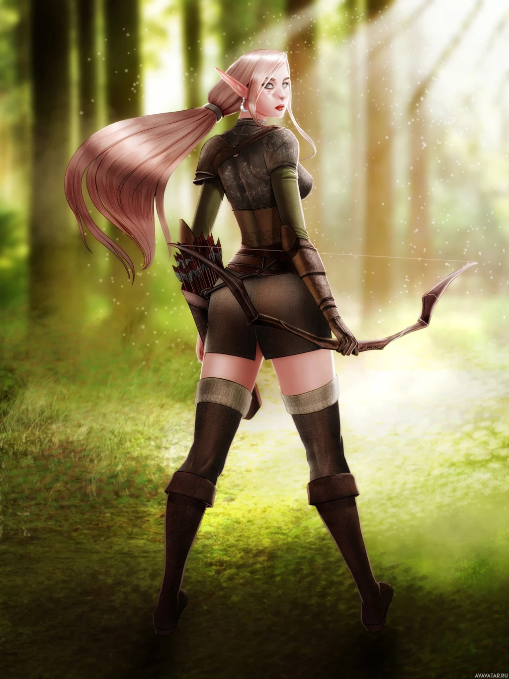 fantasy armor and holds a bow and arrow, suggesting she may be a warrior or archer. Her hair is styled into pigtails, which adds to her elven appearance. The background features misty trees that give the impression of