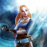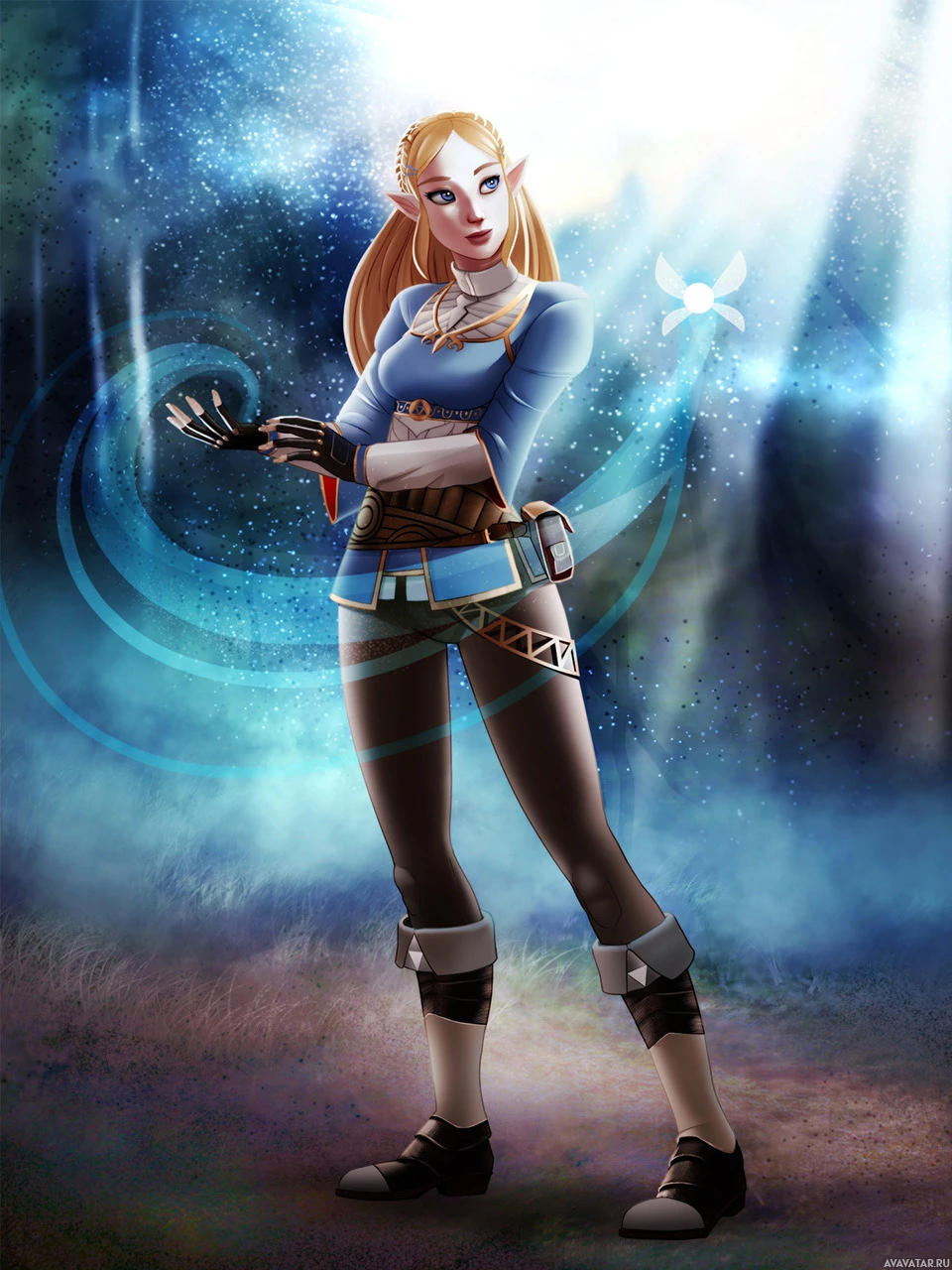 blonde hair and is wearing what appears to be armor with magical elements, such as glowing blue runes on her glove and a necklace. She also has a sword sheathed at her side. The background suggests