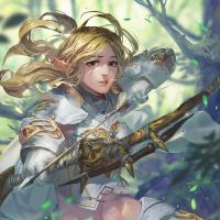 The image features a fantasy-themed illustration of an elven female character. She has blonde hair, is wearing what appears to be armor with gold accents, and holds a bow in her hand. She is situated within a forest setting with green foliage around her. This character could be associated with archery or combat due to the presence of the bow.