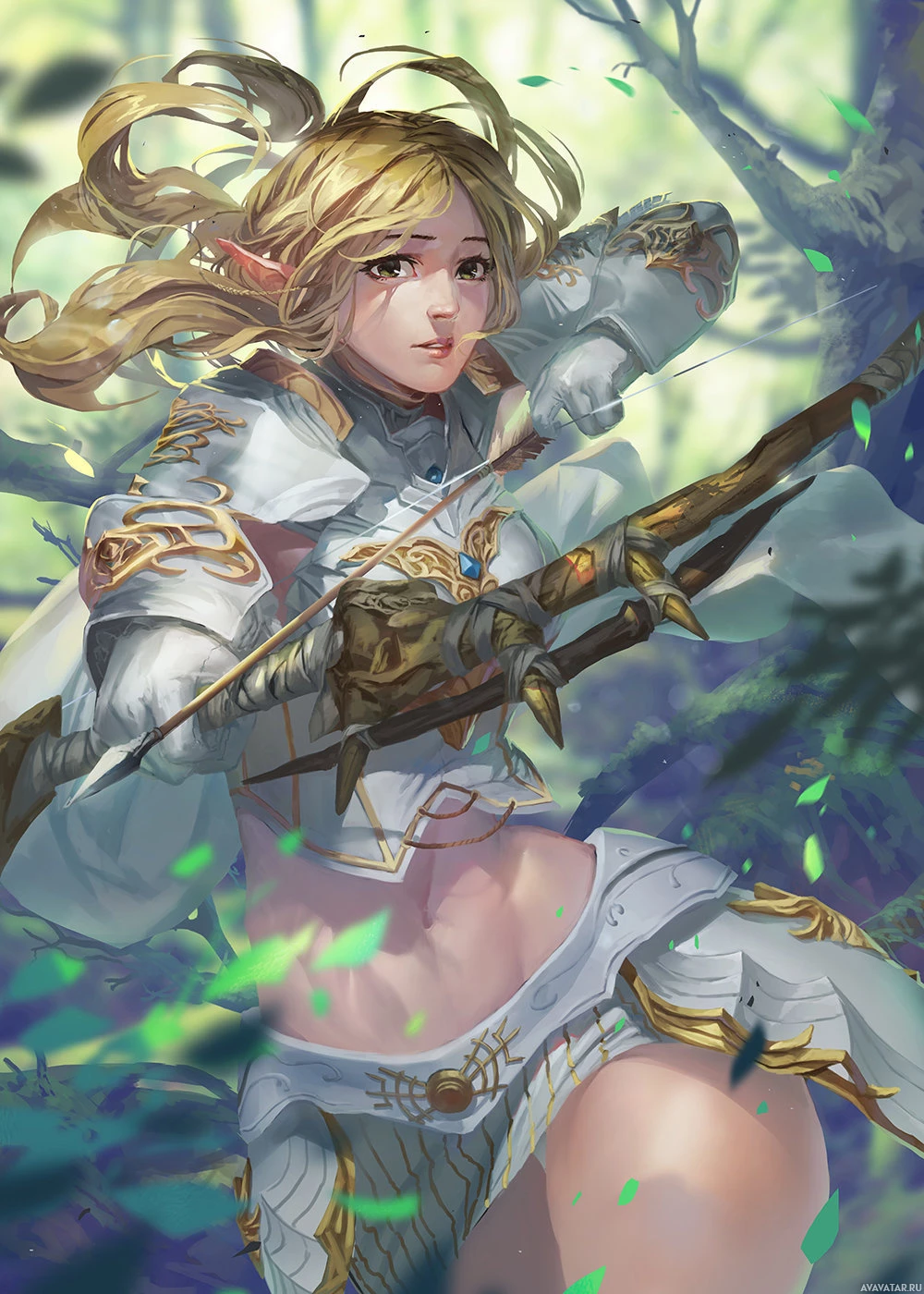 На картинке изображен эльфийский персонаж женского пола в стиле фэнтези. У нее светлые волосы, она одета во что-то похожее на доспехи с золотыми вставками и держит в руке лук. Она находится в лесу, окруженная зеленой листвой. Этот персонаж может ассоциироваться со стрельбой из лука или боем из-за наличия лука.
