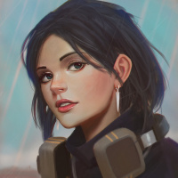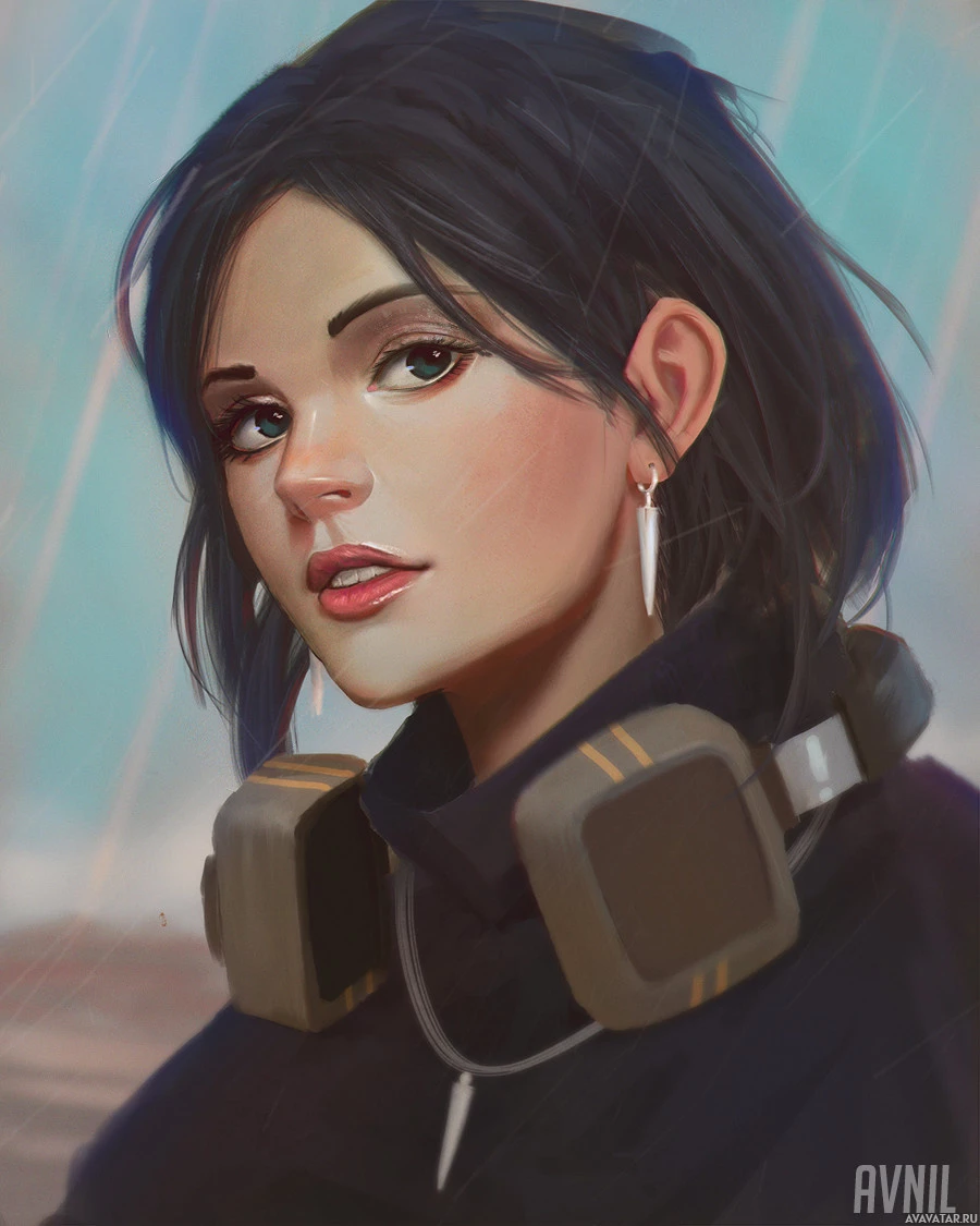 green eyes, and her expression is serious or contemplative. The character is wearing a black headset over her ears, which suggests she might be a gamer or involved in some sort of audio-