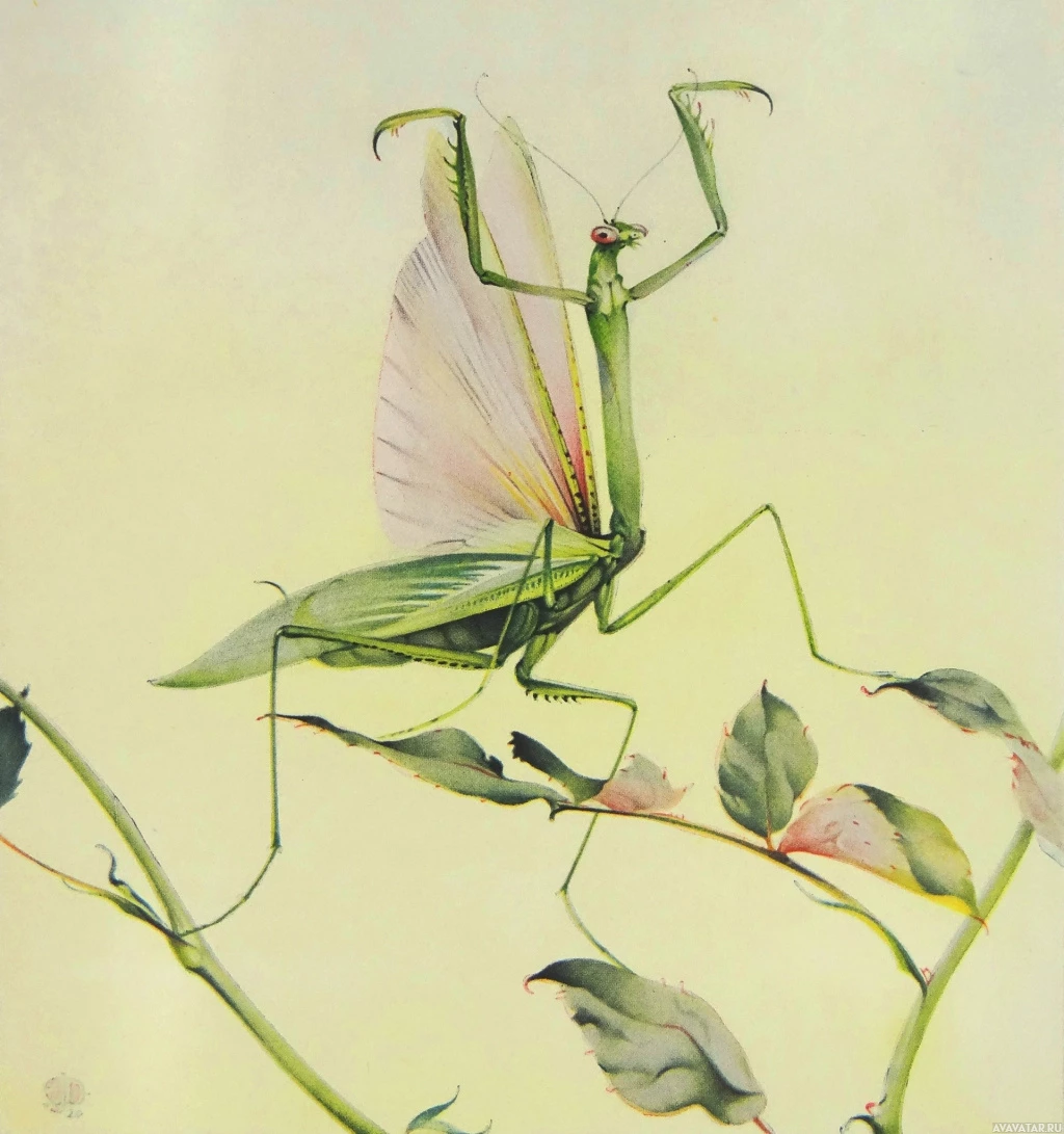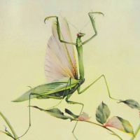 the natural environment where these insects can often be found. The overall impression is one of precision and delicacy in the artwork, capturing the intricate details of the mantis's body and its surroundings with clarity and care.