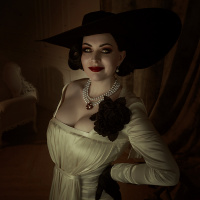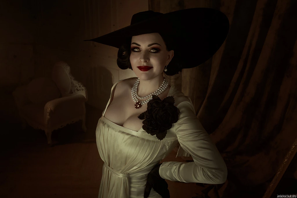 In the image, there is a person dressed in an elaborate costume that resembles Lady Dimitrescu from