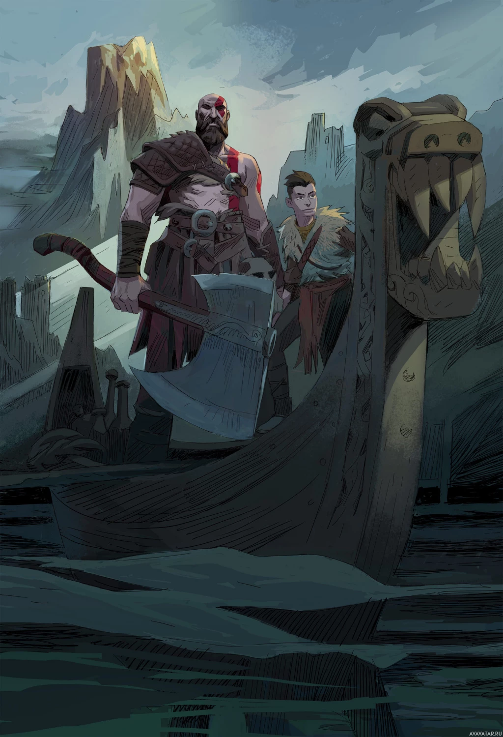a large axe, another standing between them with a bow and quiver of arrows, and a third character on the right holding a staff with a snake emblem atop it. They are all standing aboard a boat that appears to be traveling through