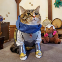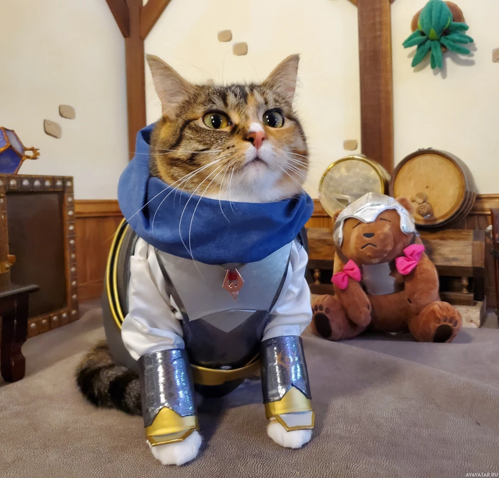 In the picture, there is a cat wearing clothes that resemble a costume. The outfit includes what appears to be armor or