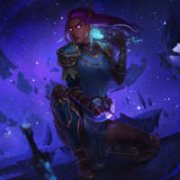 purple hair, wearing armor that suggests a fantasy or game setting. The character is sitting in what appears to be an otherworldly environment with