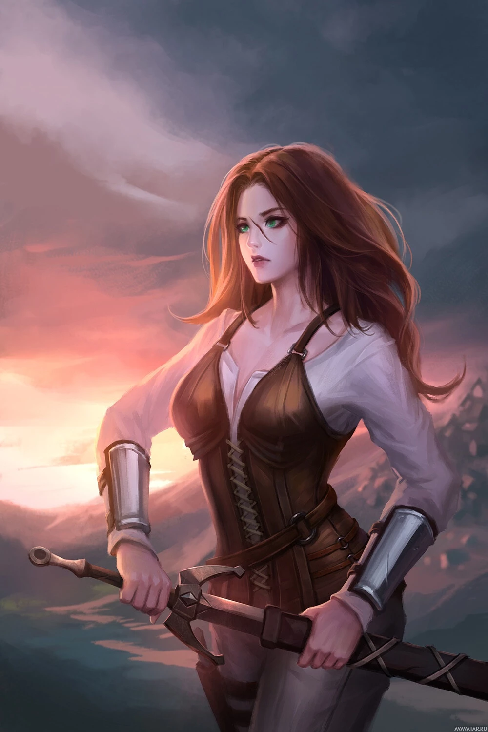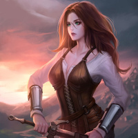 armor pieces and possibly a corset. In her hands, she holds what appears to be a sword. The background suggests a dramatic setting, possibly at sunrise or sunset over