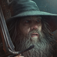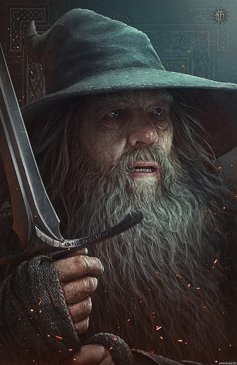 На картинке изображен пожилой волшебник, вероятно, персонаж Гэндальфа из "Историй о Средиземье" Дж.Р.Р. Толкина. Он держит меч и, кажется, находится в состоянии удивления или озабоченности. Фон имеет шероховатую текстуру, похожую на сажу или пепел, что наводит на мысль о сцене интенсивного действия или опасности.