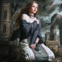 На картинке изображена женщина, которая, кажется, стоит на коленях среди руин, что может указывать на сцену разрушения или последствий. Она носит то, что кажется исторической одеждой и имеет длинные волосы. На заднем плане летают птицы, добавляя в мрачную атмосферу. Сцена выглядит так, как будто она может быть из фэнтези или исторического повествования.