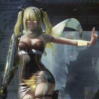 melee weapon. The environment around her has an industrial look with pipes and structures that could be part of