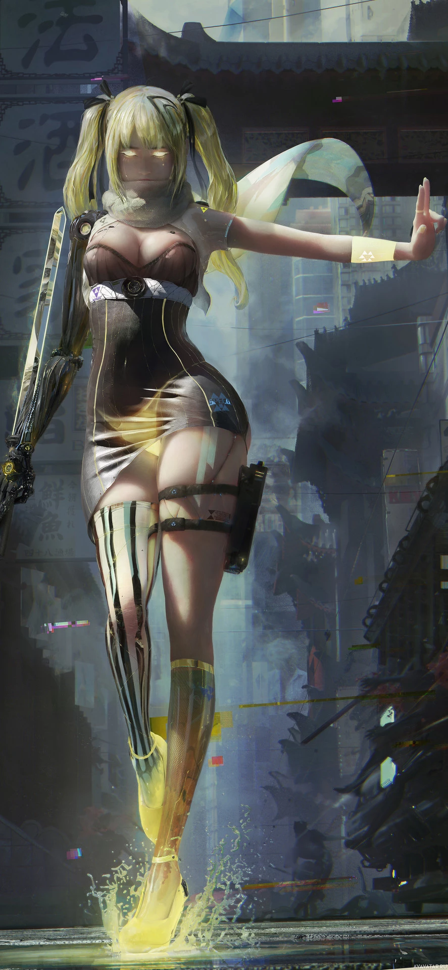 mechanical parts on her body, suggesting she may be a cyborg or robotic entity. She is standing confidently with one hand on her hip and the other holding what looks like a weapon, perhaps a gun or a futuristic