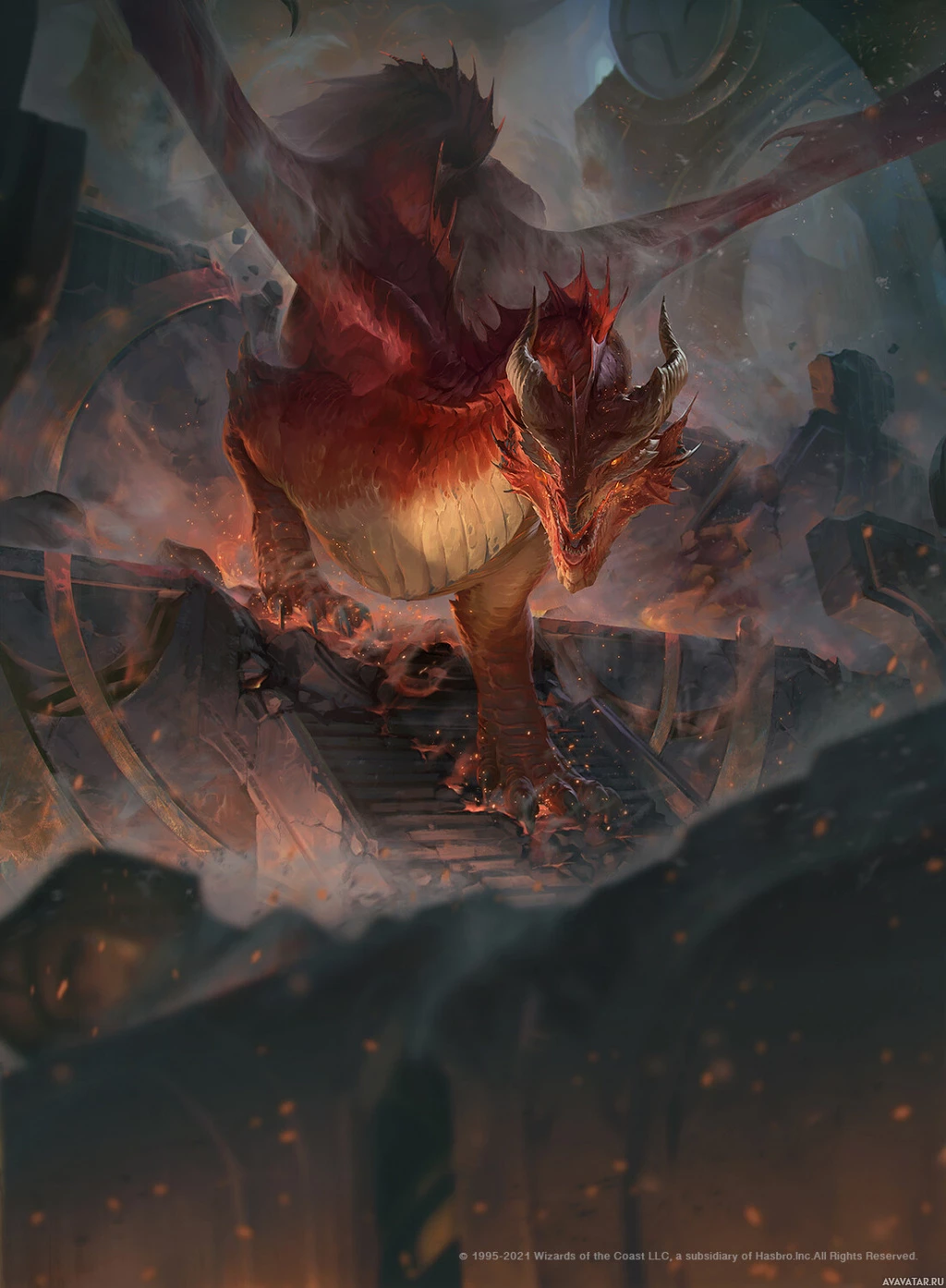 an intense battle or chaotic event, as suggested by the surrounding destruction and explosions. The fantasy elements are emphasized through the design of the dragon, which has intricate scales,